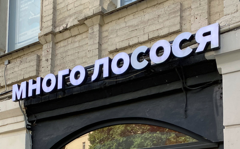 Для стильного гастропроекта «Много лосося» мы установили входную дверь с максимальной площадью остекления – эффектное и функциональное решение.